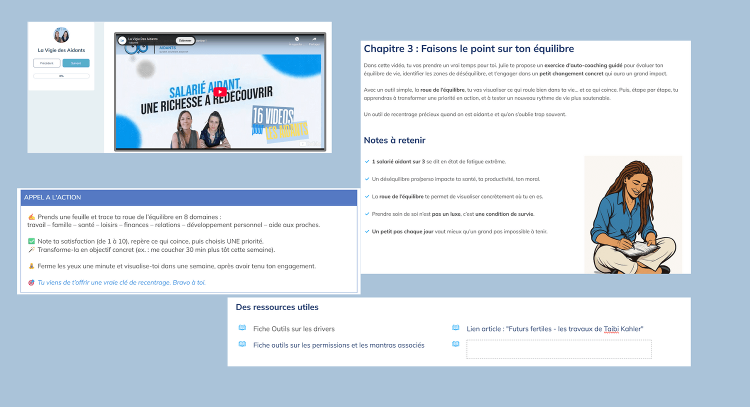 Des capsules courtes et accessibles, sans jargon, accompagnées d’outils simples et concrets. Vous pouvez avancer pas à pas et agir rapidement, même avec peu de temps disponible.
